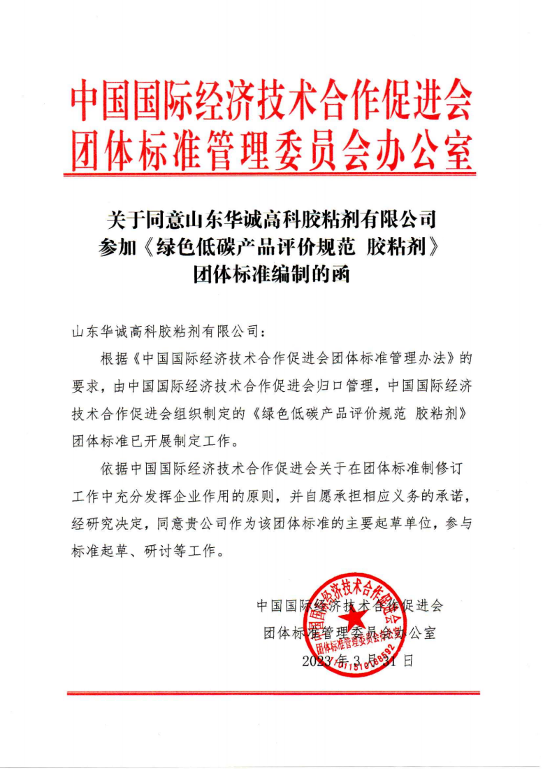 近日,山東華誠(chéng)高科膠粘劑有限公司參編《膠粘劑制造行業(yè)綠色工廠評(píng)價(jià)規(guī)范》、《綠色低碳產(chǎn)品評(píng)價(jià)規(guī)范 膠粘劑》兩項(xiàng)團(tuán)體標(biāo)準(zhǔn)。